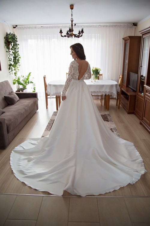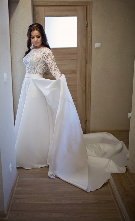 Góra sukni wraz z odpinanymi rękawami wykonana jest z gipiury , dół i odpinany tren długości około 2 m jest z materiału MIKADO w kolorze Ivory/Ecru.
