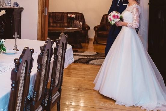 Sprzedam suknię ślubną z salonu Elizabeth Konin kolekcja 2017, rozmiar S/M. Sukienka z trenem z możliwością jego podpięcia.