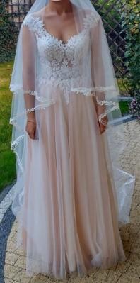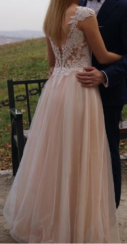 Suknia została zakupiona w salonie w Krakowie. Jest ona połączeniem dwóch modeli wraz z kilkoma modyfikacjami tj. wycięte plecy, beżowy kolor dołu sukni. Zachęcam również do kupna pięknego welonu, który również pochodzi z salonu Madonna. Cena do ustalenia.