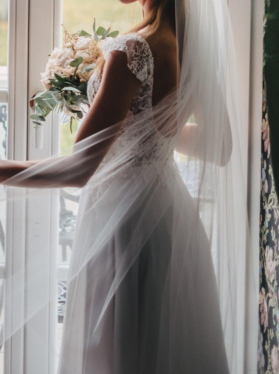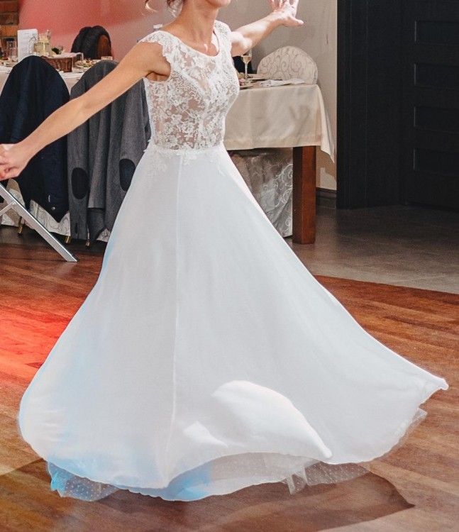 Góra wykonana z wysokiej jakości drobnej koronki podszytej cielistą, niewidoczną siateczką (istnieje możliwość wszycia miseczek). Duże wycięcie z tyłu, pięknie eksponujące plecy. Przepiękny muślinowy dół przykrywa jedną warstwę tiulowej podszewki, co zapewnia sukni niezwykła lekkość i dostojny mimo prostego, klasycznego kroju wygląd. Suknia pięknie podkreśla talię, jest bardzo wygodna i zjawiskowo układa się w tańcu.