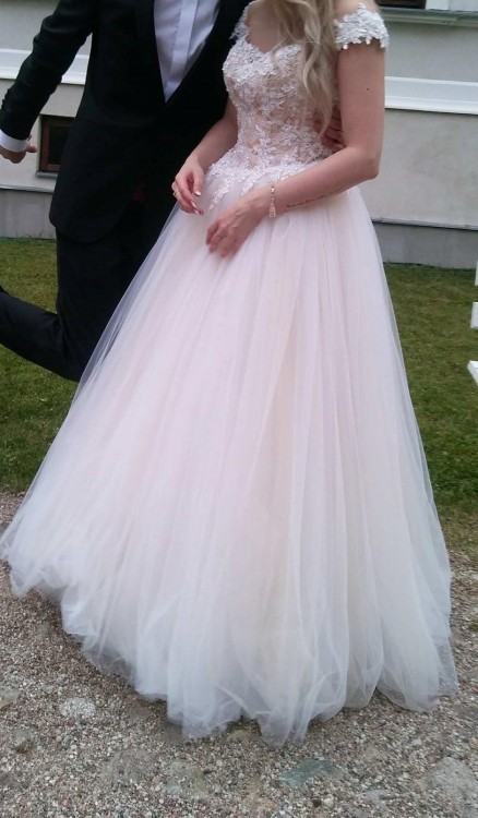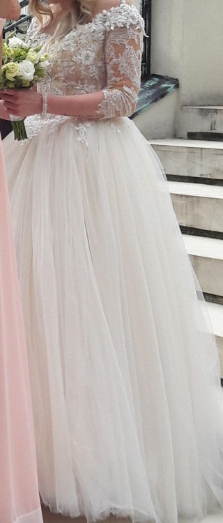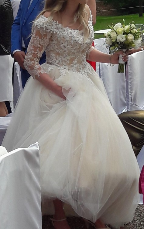 Posiadam piękną suknię ślubną Księżniczkę, kolor Ecru z salonu PARISEL kolekcja IGAR Euphoria model 1731 z własnym pomysłem. Suknia została lekko zmieniona m.in.: zostały przerobione ramiączka - są nieco grubsze i opadają na ramiona. Zostały do nich uszyte koronkowe rękawki które są odczepiane, długość 3/4 rękawa. W związku z opadającymi ramiączkami została dodana siateczka tak aby podtrzymać suknię na ciele oraz gorset, głęboki dekolt na plecach zapinany jest na kryształowe guziczki. Do jej uszycia użyto większej ilości tiulu tak aby dodatkowo podkreślić wcięcie w talii. Suknia uszyta na 164 cm wzrostu + 6,5 cm obcas. Przy zakupie sukni buty sprzedam w dobrej cenie - 49 zł, rozmiar 38 (widoczne na zdjęciach). Kupiłam je w tym samym salonie pomimo, iż posiadałam już buty do ślubu jednak te przebiły pierwszą parę- wygodniejszych nigdy na nogach nie miałam. Cena do negocjacji.