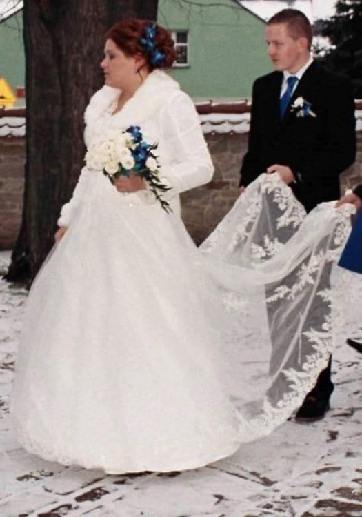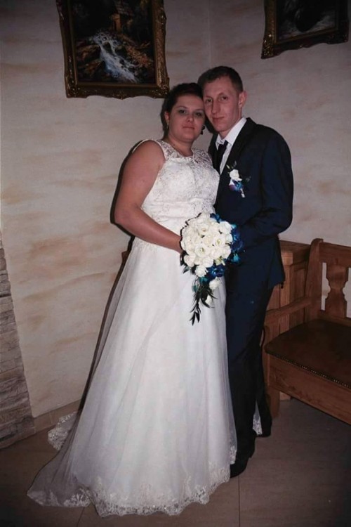 Suknia jest zdobiona koronką na gorsecie I na kształt trójkąta od pasa do dołu. Suknia jest na kole co daje swobodę w tańczeniu tren podpina sięna dwa guziki co pozwoli uniknąć nie ładnej.fałdy. suknia ma dużą regulację. Gratis dodaje buty rozmiar 39 ubrane tylko do kościoła