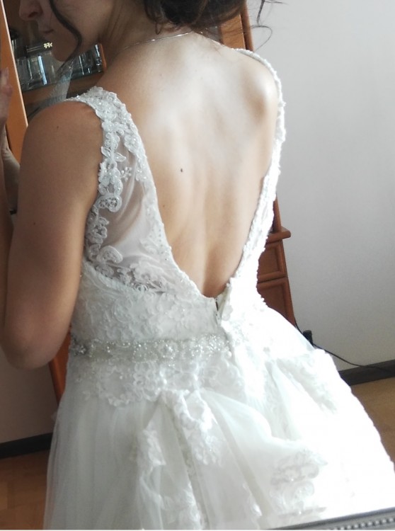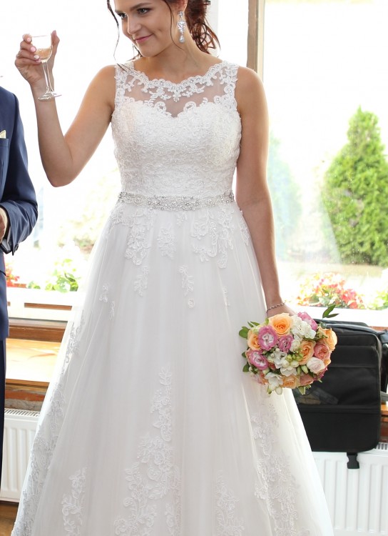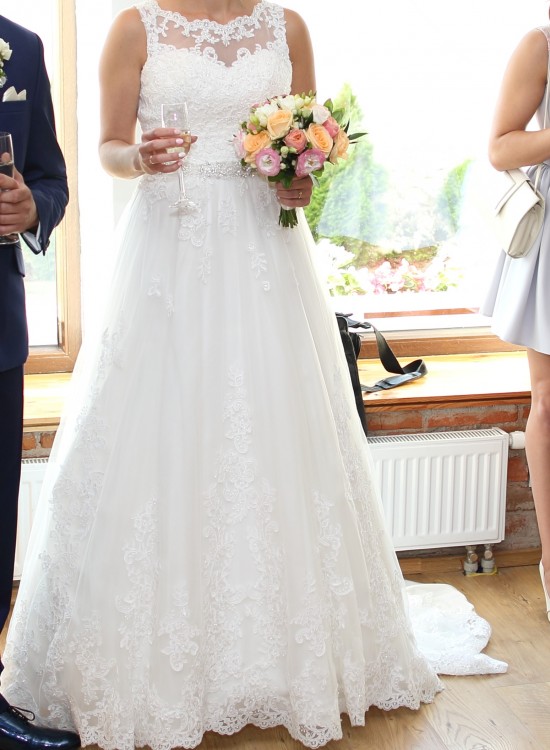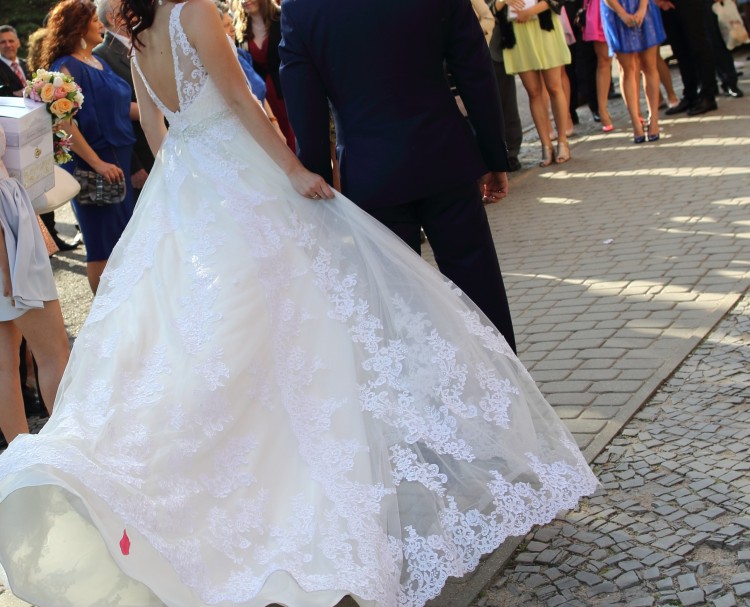 Witam mam do sprzedania przepiękną suknię ślubną w kolorze ivory. Suknia jest idealna, elegancka. Bardzo ładnie podkreśla talię, Szyta na rozmiar 38/40 na wzrost 170 cm + 9 centymetrów obcas. Suknia ma odkryte plecy i pięknie zdobiony koronkami gorset, posiada tren również wyszywany koronką (tren jest podpinany). Zapinana na zamek i guziki. Bardzo wygodna oraz bardzo efektowna, cudnie rozkłada się podczas tańca.Halka z wszytym kołem gratis. W razie pytań i dodatkowych zdjęć proszę o kontakt mailowy.Serdecznie polecam.