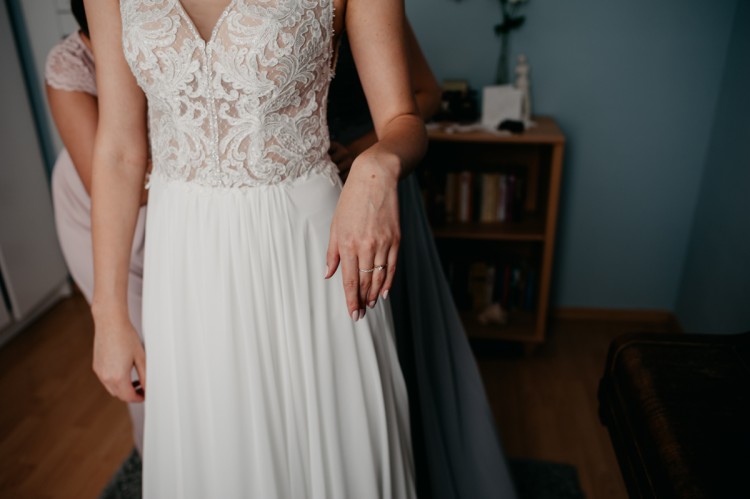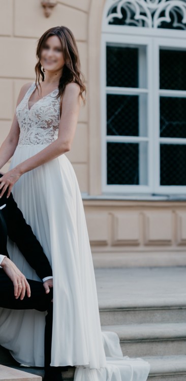 Do sukni dołączona jest dodatkowa halka z tiulu (bez koła), która sprawdza się świetnie w czasie wesela i ułatwia taniec. Ogólnie suknia jest wygodna i lekka, spódnica przepięknie układa się podczas tańca. Tren przypinany jest na przezroczyste zatrzaski.