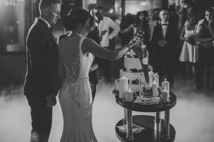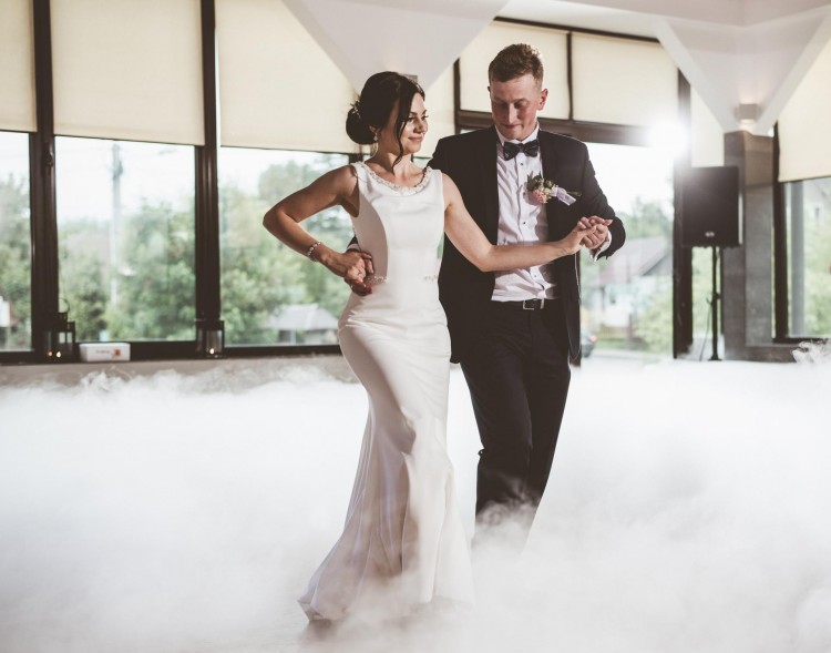 Suknia przybiera kształt rybki. Posiada podpinany tren, aplikację biżuteryjną na plecach oraz delikatne zdobienia po bokach i na dekolcie. Pięknie prezentuje się podczas tańca.