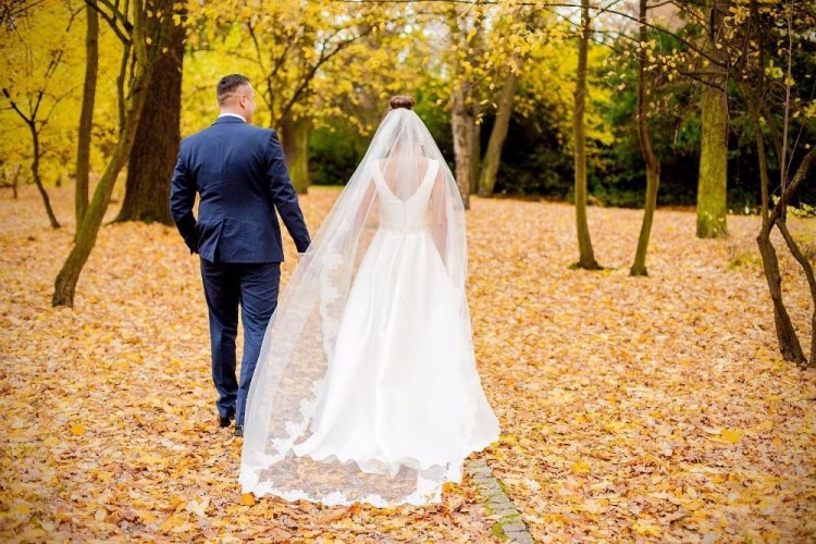 Suknia z trenem oraz pięknym welonem w stylu hiszpańskim.
