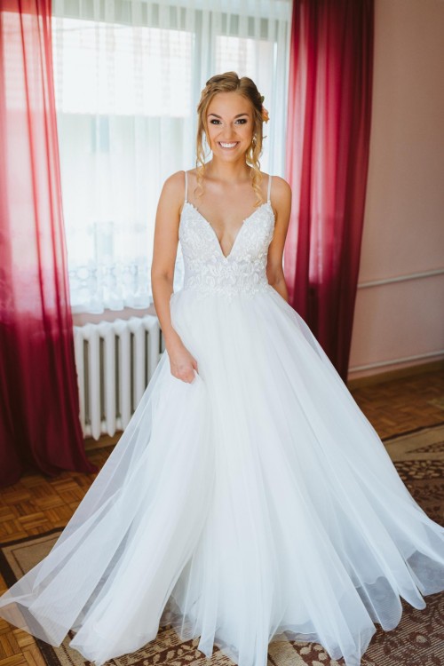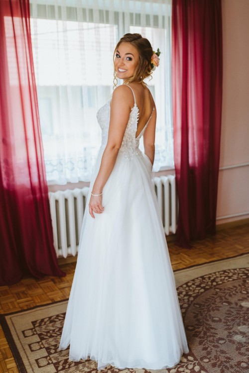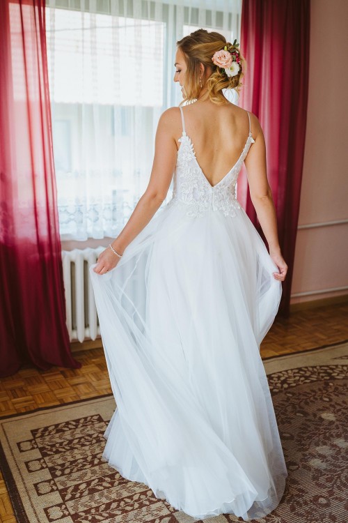 Suknia jest lekka, zwiewna i delikatna, a zarazem bardzo kobieca, seksowna, a dzięki tiulowej spódnicy z pewnością poczujesz się w niej jak księżniczka!