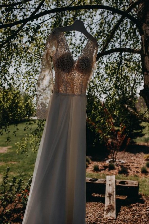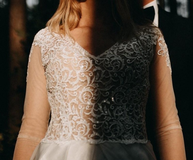 Dół sukni uszyty został z nakładających się na siebie kawałków materiału, z dwoma rozcięciami po bokach (nie są jednak widoczne). Powodują piękne układanie się sukni uśmiech