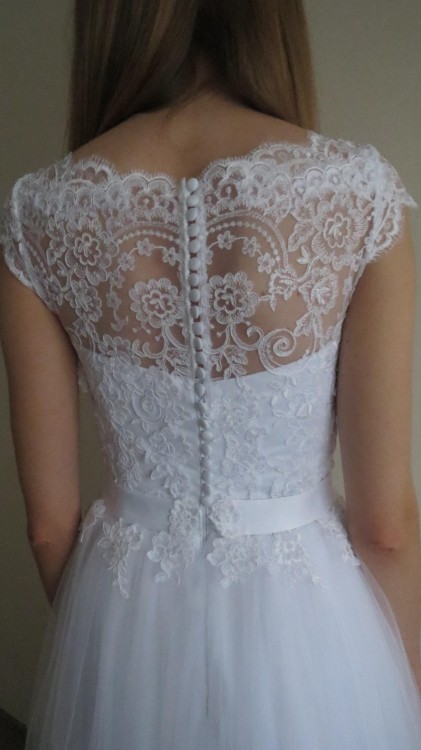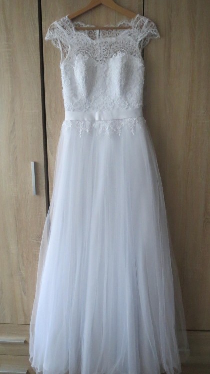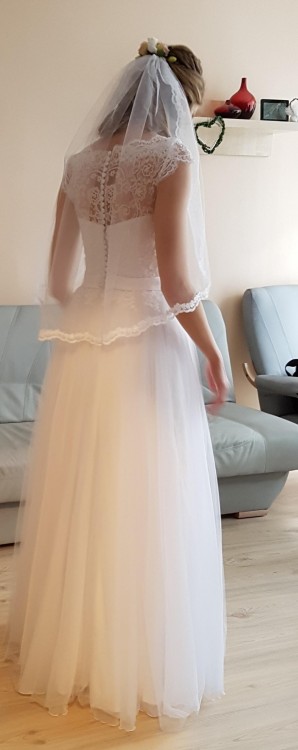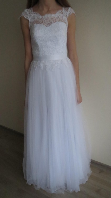Sprzedam suknię ślubną w odcieniu śnieżnej bieli uszytą na indywidualne zamówienie z pięknej koronki i tiulu. Suknia posiada tren podpinany na dyskretne guziki, dzięki czemu efektownie prezentuje się na zdjęciach i jest wygodna do tańca. Suknia zapinana na zamek błyskawiczny i guziczki.