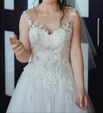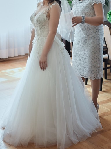 Sprzedam suknię ślubną typu Princess w kolorze śmietankowej bieli. Suknia została uszyta na miarę w salonie Diana w Rzeszowie. Projektem wiodącym była suknia Eddyk z modyfikacjami na plecach,gdzie został dodany śliczny głęboki dekolt V obszyty delikatna taśmą. Suknia została uszyta na rozmiar 34/36, wzrost 158cm + 11cm obcas. Cena katalogowa w salonie 3980 zł.