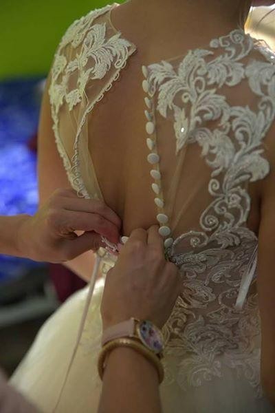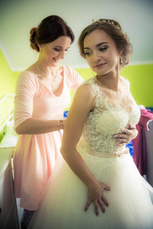 Kolor sukni to ecru. Suknia posiada wiązany gorset dzięki czemu idealnie dopasuje się do figury. Dodatkowo posiada guziczki. Mój rozmiar to 34/36. Sukienka uszyta na wzrost 165 + obcas 12 cm, gorset bogato ozdobiony koronką oraz wyszywany perełkami. Suknia składa się z kilku warstw, które pięknie się układają w tańcu i chodzie, z czego trzy to tiul. Dodatkowo do sukni jest dołączona osobno do założenia sztywna halka dzięki czemu suknia nie plącze się miedzy nogami w tańcu. Jest lekka- nie posiada koła, z drugiej strony nie czuć tej sukni w ogóle na sobie, pełna swoboda wszystkich ruchów. Dół sukni nie posiada żadnych zdobień, dzięki czemu można ją jeszcze skrócić dla drobniejszej Przyszłej Panny Młodej lub doszyć koronkę i przedłużyć.