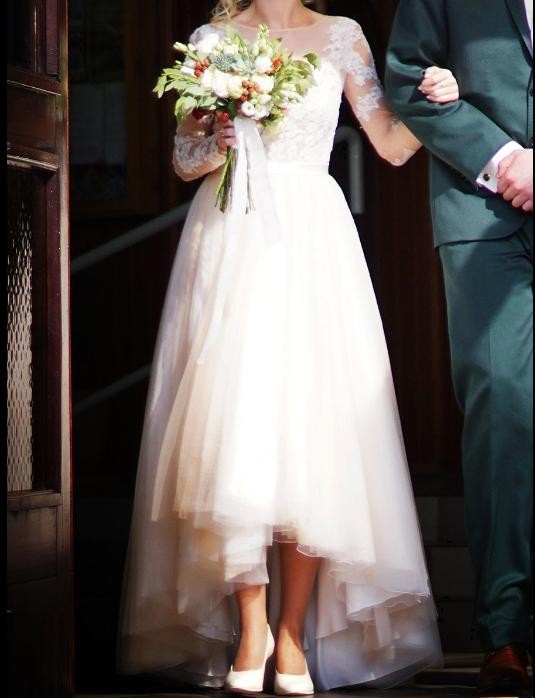 Suknia ślubna z salonu AMY LOVE to niepowtarzalne połączenie sukni Nela i Lauri. Suknia w kolorze śmietankowym z warstwą w kolorze nude. Zapinana na suwak, który idealnie wtapia się w suknię. Wewnątrz wszyte miseczki zastępujące stanik. Suknia z przodu sięga do połowy łydki, z tyłu całkiem długa. Suknia w stanie idealnym, nie miałam dodatkowego pleneru po ślubie.