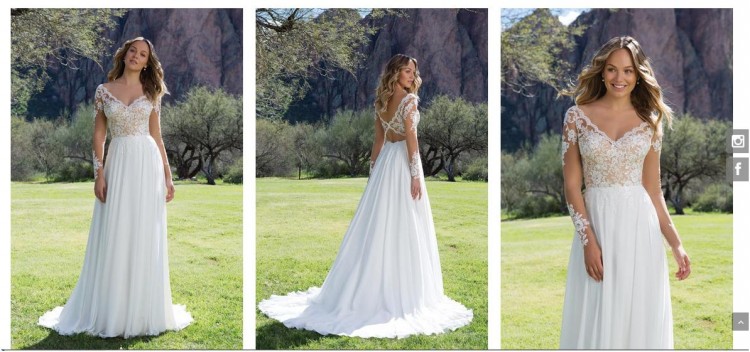 Suknia ślubna w kształcie litery A zaakcentowana długimi rękawami. Koronkowe aplikacje oraz dekolt wycięty w literę V nadają sukni lekkości i eteryczności. Całość dopełnia lekka szyfonowa spódnica.