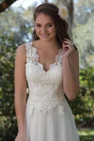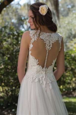 lekka, zwiewna, romantyczna suknia Sweetheart 6171 – suknia z połyskującym, koronkowym gorsetem w szpic. Iluzoryczne plecy, cudownie wyeksponowane z misternym haftem. Kolor: sand/ivory/nude. Piękna i zmysłowa kreacja. Rozmiar z metki USA 10. (noszę 40-L). Suknia z wypuszczanym trenem, mój wzrost 168cm, preferowana osoba niższa, ze względu na zniszczony dół przez obcasy. Suknia wyprana w pralni. Naprawię dół sukni ale czekam na kupca, żeby zrobić już pod przyszła pannę młodą lub naprawa we własnym zakresie a ja obniżę cenę. Suknia zachwyciła wszystkich gości. Dla mnie bardzo wygodna i lekka. Oprócz zniszczonego butami dołu (co jest naturalne) suknia w stanie idealnym!! gorąco polecam!!