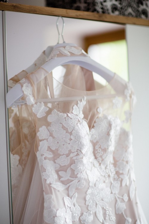 Składa sie ona z dwóch części: dopasowanej sukni oraz odpinanego dodatkowego, tiulowego pasa (pas zapinany na kryte pod koronką guziczki). Sukienka z tyłu posiada wycięcie w kształcie litery V - minimalistyczne bez zadnych guzików biegnących wzdłuż kręgosłupa, odcinek ledzwiowy zapinany na kryty zamek. Suknia zdobiona piękna roślinna koronka. U dolu posiada taśmę sztywnik, dzięki czemu lepiej sie uklada i przy tańcu nie plącze miedzy nogami. Tył sukni delikatnie dłuższy.