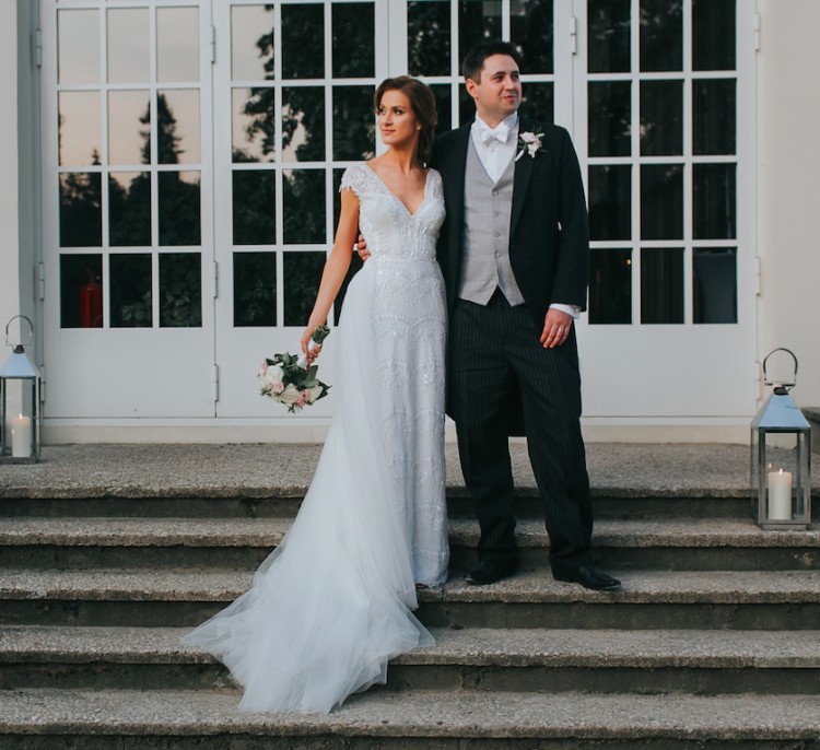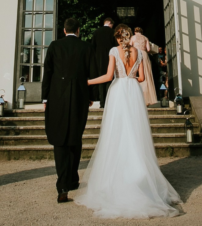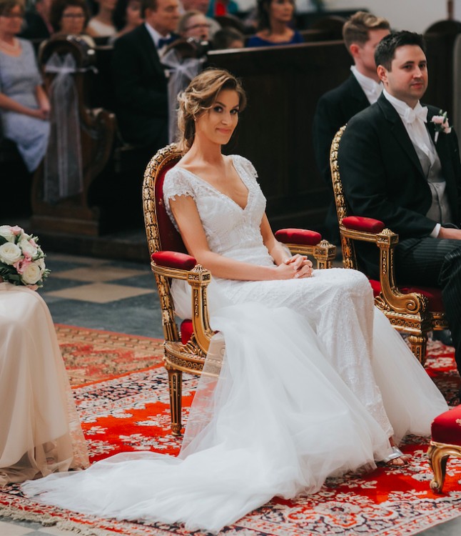 Suknia byla uszyta na miare w atelier Violi Piekut. Dlugosc do ziemi, gleboki dekolt na plechach i umiarkowany z przodu. Jedwabna halka, na to wszechobecna koronka wykonczona doczepianym trenem z jedwabnego tiulu ktory pieknie sie wloczy, a po odpieciu nie wchodzi w droge. Warstwa z koronki jest zdobiona koralikami, cekinami i krysztalkami.