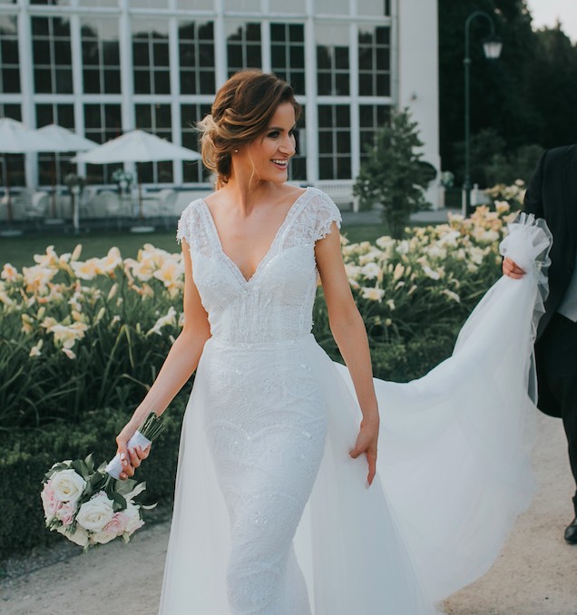 Piekna dopasowana koronkowa suknia ze zdobieniami i doczepianym trenem z jedwabnego tiulu