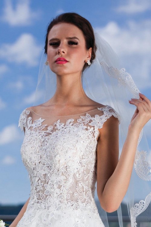 Suknia szyta na miarę. Rozmiar 34-36, wzrost 165cm i około 9 cm obcas, kolor ecru. Góra koronkowa z kryształkami Svarovskiego, pięknie się mieni, ma wszyte miseczki, a dól tiul z kołem, które można wyjąć, posiada podpinany tren. Zakupiona za 2700 zł