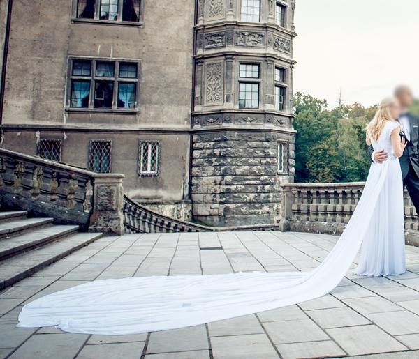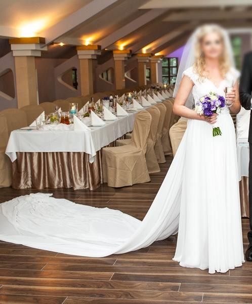 Suknia z rozcięciem na nogę i długim 4m trenem!