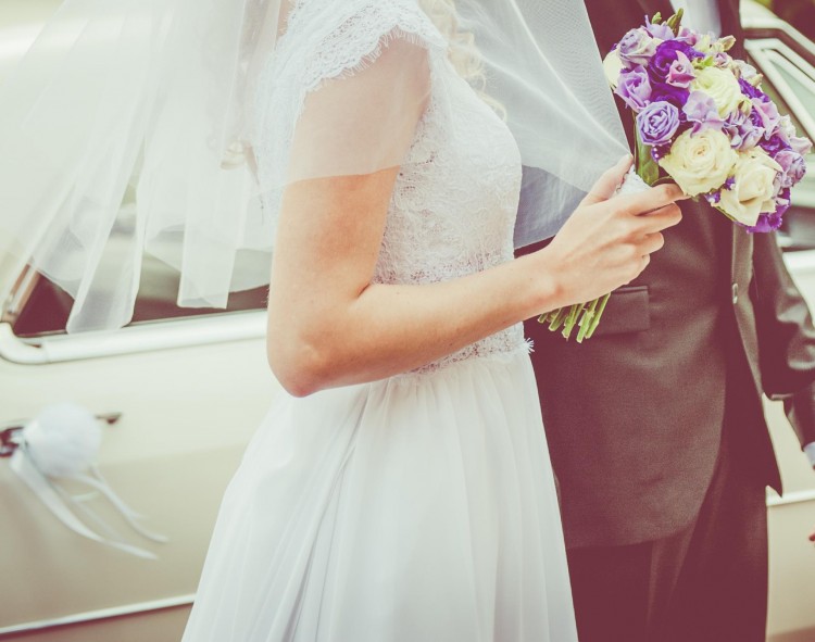 Koronkowa suknia ślubna GRAZIA z rozcięciem na nogę i długim odpinanym trenem (4m długości!) w kolorze: śnieżna biel. Szyta na miarę. Zakupiona w Warszawie w Atelier Violi Piekut.