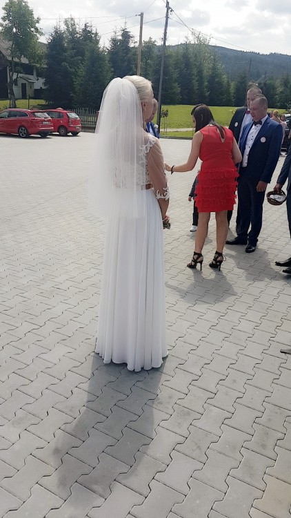 Cudowna suknia ślubna w stylu greckiej bogini :) W zestawie długi tren dopinany na niewidoczne klipsy, krótki welon oraz bluzeczka (zakrywajaca dekolt z koronką na przedramionach). Z wycięciem na prawej nodze. Stan bardzo dobry. Niesamowicie zwiewna, lekka i wygodna. Polecam :)
