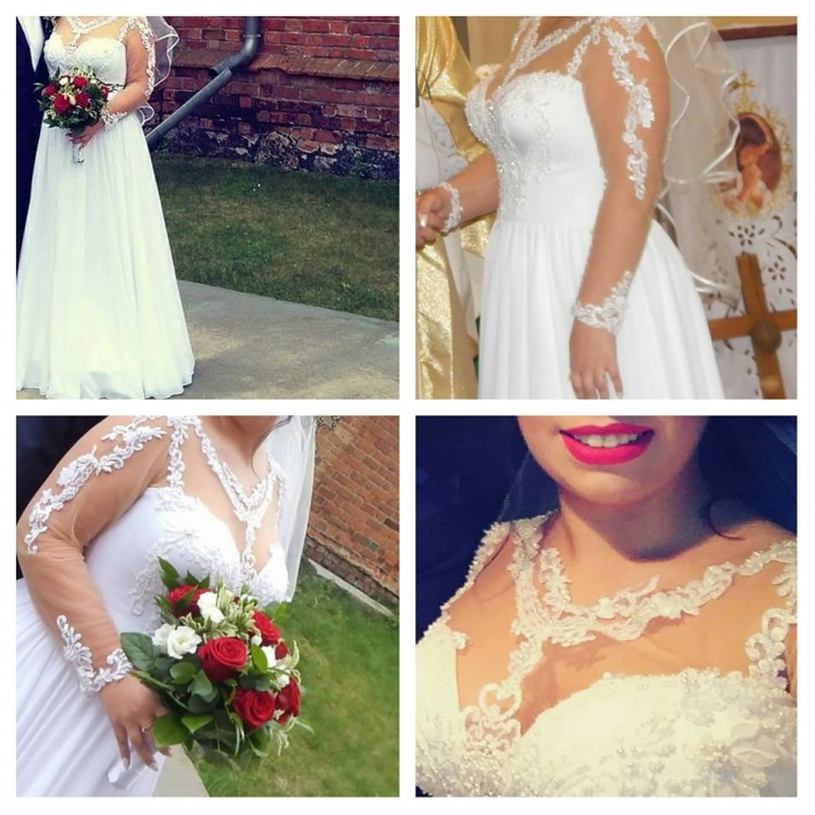 Suknia jest kupiona w tym roku z nowej kolekcji 2017 roku i posiada szycie w literkę A. Jest śnieżnobiała z lejącym się dołem który niesamowicie wydłuża oraz kamufluje wszelkie niedoskonałości. Suknia ma piękną zdobioną górę która eksponuje nasz biust, pomimo tego wszystko jest idealnie zakryte i nie ma obaw że cokolwiek nie oczekiwanego się stanie. Suknia jest z tyłu zapinan na suwak oraz guziczki. Posiada długi rękaw, ale nie ma problemu z jego usunięciem. Rozmiar 40-42 vs 42-44. Pomimo tak dużego rozmiaru w tej sukni nie widać tego. Suknia nadaje się również do drobnych przeróbek. Dostosowana jest do nie całe 180 cm ale nie ma problemu z jej skróceniem.