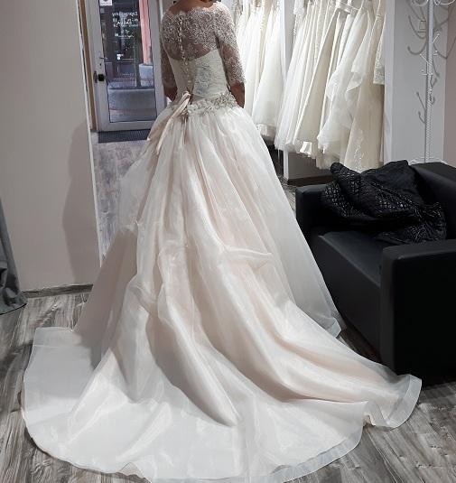 Suknia w kolorze ecru, jedna z dolnych warstw jest w kolorze przełamanego pudrowego różu, co nadaje jej młodzieńczy wygląd.