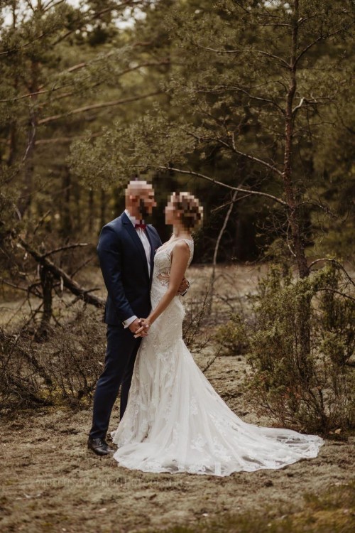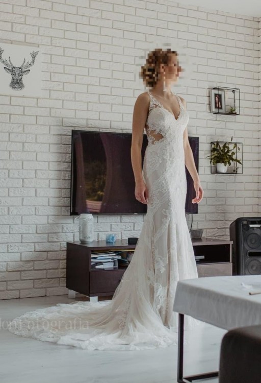 Przyszedł czas rozstać się również z moją suknią ślubną z kolekcji Lillian West 2018r. model 6521. Suknia o fasonie ryby, syrenki ale nie krępująca ruchów. Jest cała pokryta bardzo oryginalną koronką, w pasie posiada wycięcia podkreślające talię oraz dekolt V. Suknia posiada lekki przepiękny tren, który oczywiście można podpiąć. Rozmiar sukni to 8, została delikatnie zwężona w biodrach. Nie była skracana zatem pasuje na dziewczyny o wzroście 173 + 9 cm obcas (w moim przypadku). Posiada wszyte miseczki push up, które w razie potrzeby można odpruć.