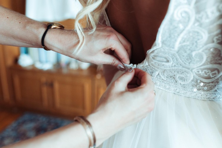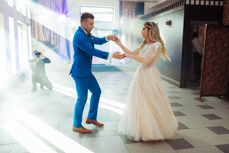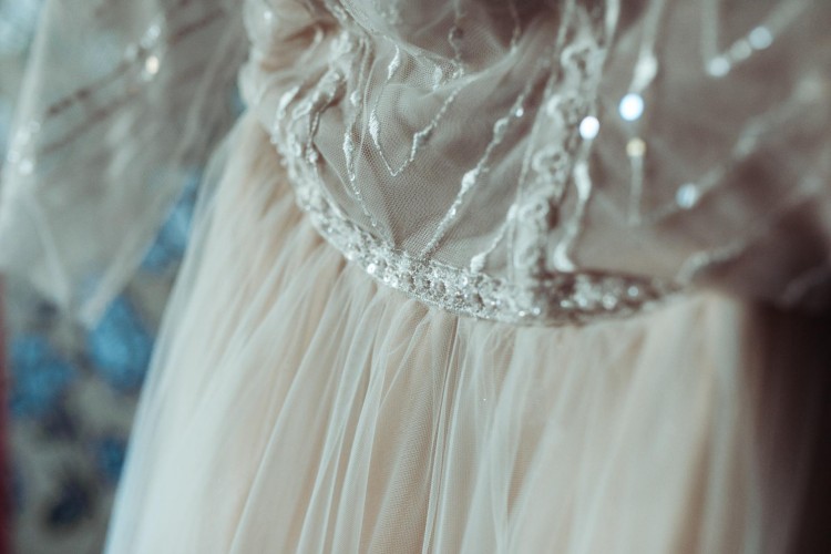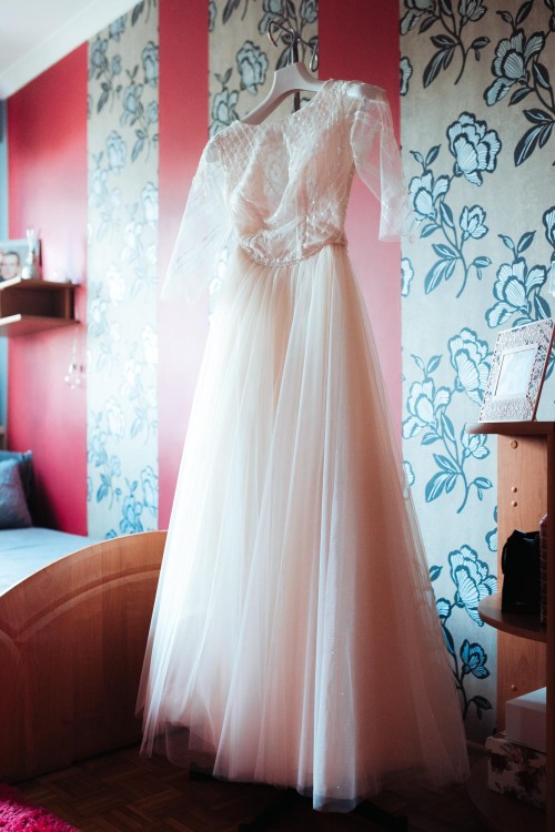 Suknia ślubna z oryginalną koronką zdobioną cekinami. Dół tiulowy w kolorze szampańskim z delikatnym brokatem. W talii ozdobny pasek. Dekolt w łódkę, plecy wycięte w kształcie litery V. Delikatny rękaw o długości 3/4. Szyta na 165 cm + 8 cm obcas.