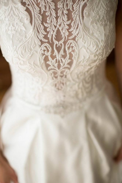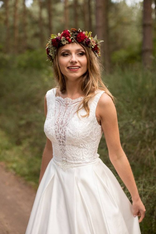 Góra sukni dopasowana, z dekoltem, zdobiona koronką w duży jedwabny wzór, spódnica jest perfekcyjnie wykonana z przepięknego materiału mikado, który pięknie się układa i nie gniecie. Pas ozdobiony kryształami svarowsky. . Posiada dwie dyskretne kieszenie :) Ma odpinany krótki tren .
