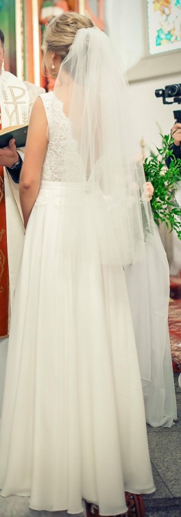 Suknia ślubna zakupiona w salonie Mariaż. Pochodzi z kolekcji z 2017 r. Suknia w kolorze iviory.