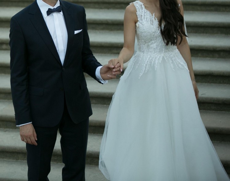 Suknia szyta na 164 cm wzrostu + 8-centrymetrowy obcas. Na co dzień noszę rozmiar 34 lub 36. Suknia nie posiada trenu. Po sesji zdjęciowej została profesjonalnie wyprana.
