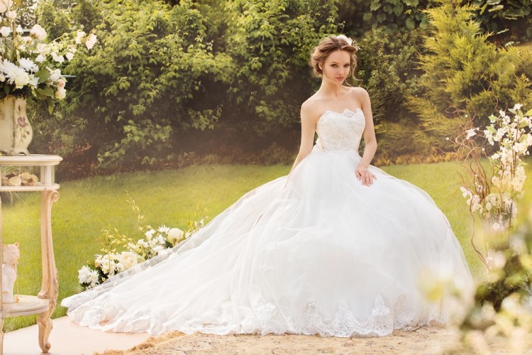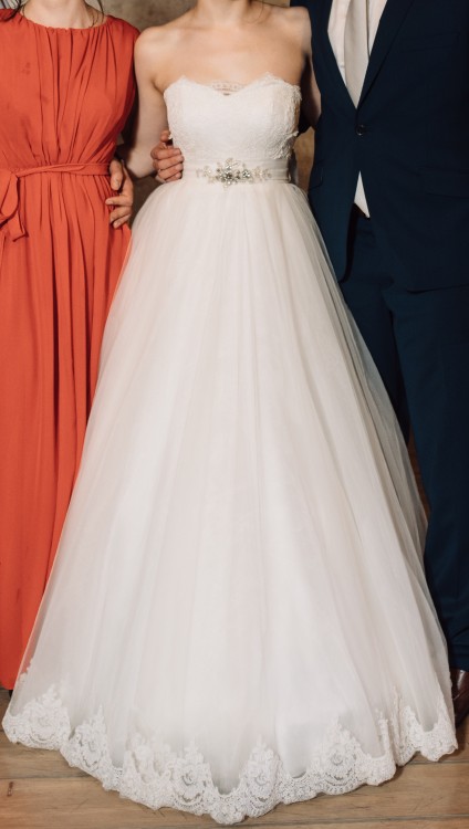 Suknia jest bardzo lekka typu „księżniczka”. Tiul u dołu sukni jest zdobiony dobrej jakości koronką. Gorset ma kształt małych łuków i jest również wykończony koronką. Dodatkowo sukienka z tyłu na gorsecie ma naszywane kwiaty. Suknia posiada podpinany tren.
