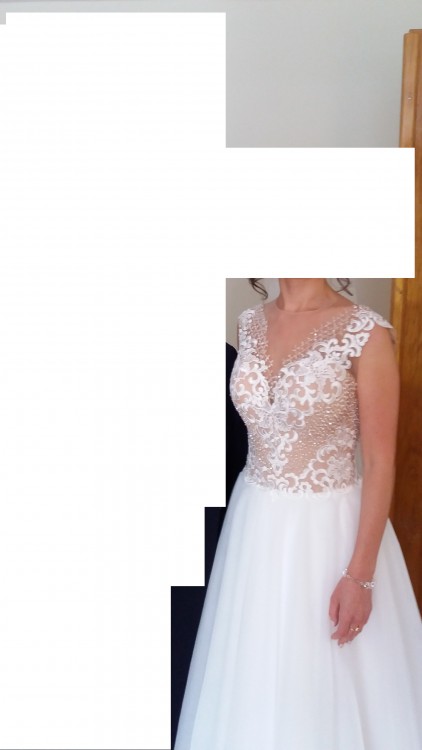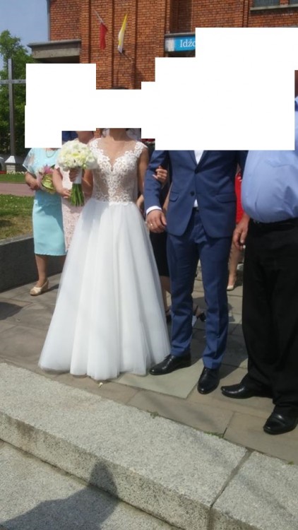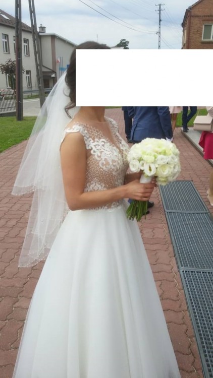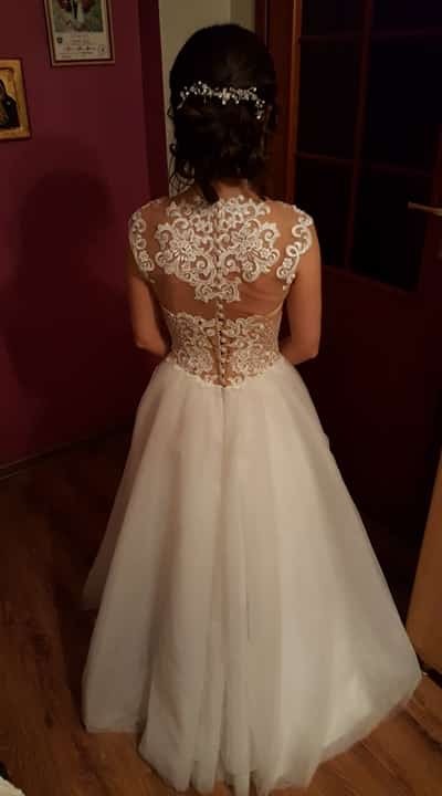 Suknia szyta we Włoszech. Gipiurowa koronka, ręcznie wyszywane koraliki. Koraliki pięknie się mienią na żywo przy każdym ruchu. Suknia jest bardzo wygodna, lekka, dół z tiulu. Szyta na wzrost ok 160cm, jednak można wymienić tiule, które będą pasować na wyższe osoby.