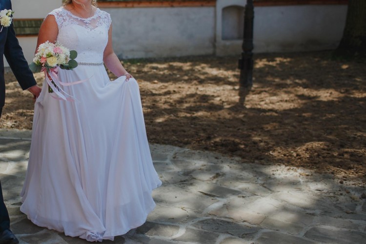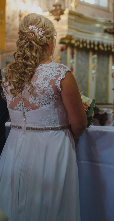 Sprzedam suknię ślubną wraz z dodatkami: welon, koło i ozdoba do włosów. Górna część zdobiona koronką i kryształkami svarowskiego. W tali posiada pasek z kryształków z możliwością wymienienia go na biżuterie (załączoną na zdjęciu). Wysokie odcięcie świetnie sprawdzi się dla Pań z ciążowym brzuszkiem. Wzrost 170 cm i 8 cm obcas, przy wyższym wzroście można zrezygnować z koło bo w obu wersjach świetnie się układa. Suknia była szyta na miarę w salonie sukien ślubnych w Katowicach. Suknia wróciłą z czyszczenia i jest gotowa do założenia.