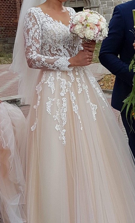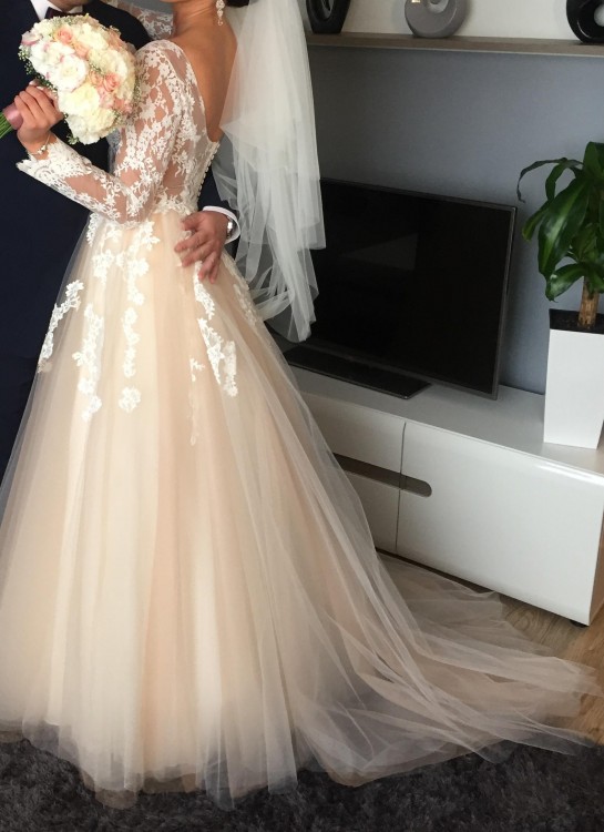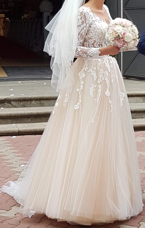 Sprzedam piękną, unikatową i zjawiskową suknię ślubną Romanica z długim trenem nadającym sukni lekkości. Delikatna i romantyczna suknia ślubna z najnowszej kolekcji 2018 r. Suknia jest w stanie idealnym. Miałam ją na sobie dwa razy, w dniu ślubu oraz na sesji. Góra sukni wykonana została z koronki naszytej na cielistą siateczkę. Dzięki cielistym miseczkom, które są wszyte, nie ma potrzeby zakładania biustonosza. Wszystko leży idealnie i nie przesuwa się, przez co nie odczuwa się żadnego dyskomfortu, w tańcu ani podczas chodzenia. Z tyłu zamek błyskawiczny przykryty drobnymi guziczkami w kolorze sukni – guziczki robione dodatkowo na zamówienie – każdy zapinany na cielistą gumeczkę. Dół sukni wykonany z bardzo eleganckiego i pięknie układającego się materiału - Suknia posiada 6 warstw delikatnego, jedwabnego tiulu. Warstwa 2, 3 i 4 są w kolorze delikatnego morelowego odcienia, który dodaje sukni wyjątkowości. Góra sukni składa się z pięknych białych zdobień 3D w postaci kwiatów. Dekolt na plecach wycięty jest w kształt litery U, a na dekolcie w kształt litery V. Suknia jest niezwykle romantyczna oraz oryginalna. Aplikacje nie uwierają ani nie przeszkadzają w tańcu. Suknia jest po profesjonalnym czyszczeniu, gotowa do mierzenia. Z tyłu długi tren – dzięki niemu suknia pięknie prezentuje się przy wejściu do Kościoła – tren podpinany na dwa guziczki- po podpięciu suknia układa się idealnie nie ma marszczeń i tren się nie odpina. Suknia pięknie prezentuje się w tańcu.
