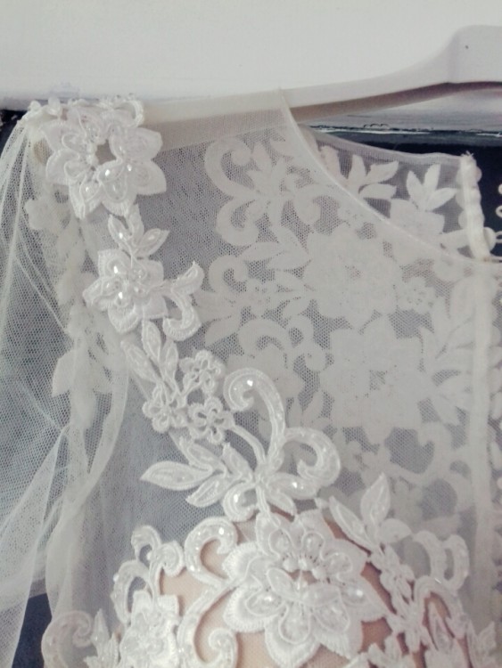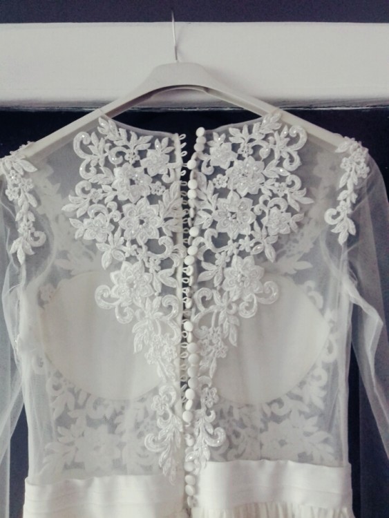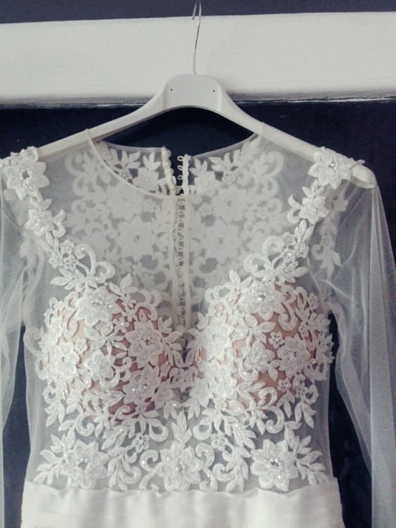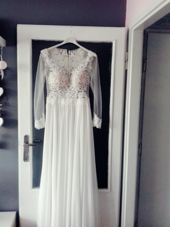 Suknia pochodzi z kolekcji 2017, jednak jej ostateczny wygląd jest moja twórczością, góra ze śmietankowa siateczką , widoczne zdobienia w postaci haftów oraz kamyczków- łezki . Dół został zmieniony z podstawowej wersji tiulowej na muślin, dzięki czemu suknia wygląda mega elegancko a przy tym nie jest ciężka. Dodany został rozpierdak dla pikanterii . Dodatkowo zostały doszyte długie rękawy że zdobieniami na ramionach oraz przy nadgarstkach. Suknia w całości śmietankowa , zapinana na guziczki z wszytymi miseczkami. Gorąco polecam.