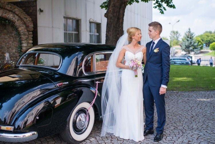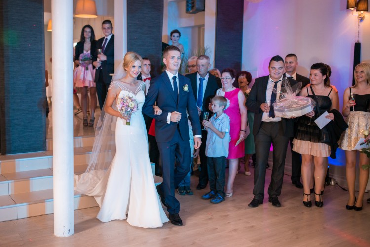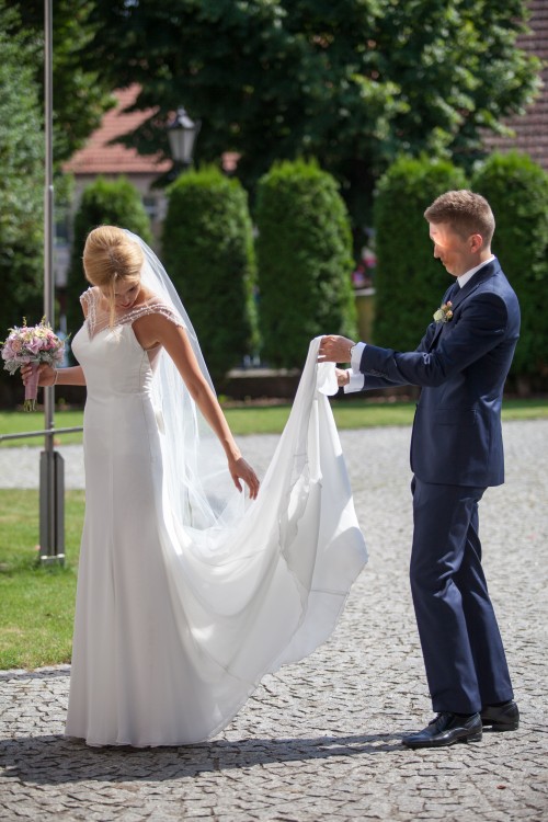 Sukienka posiada dekolt w serce, który pięknie podkreśla linię biustu. Piękne plecy z głębokim wycięciem, wykonane są z przeźroczystej siateczki oraz obszyte delikatnymi perełkami i diamencikami. Bardzo ładnie podkreśla talię. Zapinana na zamek, znajdujący się pod prawą pachą. Długi tren bez problemu można podpiąć na jeden guziczek. Jest bardzo wygodna, lekka i przewiewna. Nie ogranicza ruchów. Pięknie prezentuje się na zdjęciach, jak i w tańcu. Welon to prosty zwiewny tiul, długością sięgającą do ziemi.