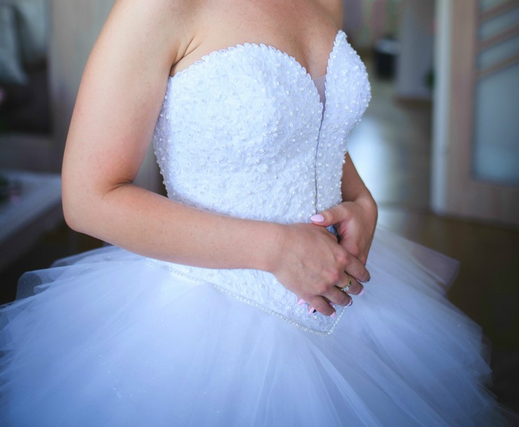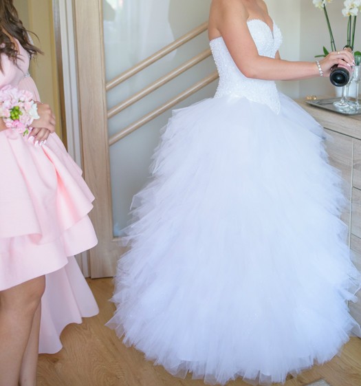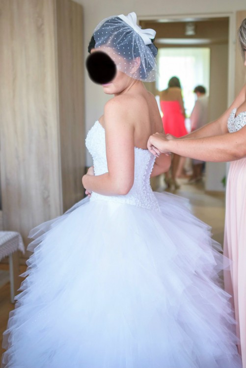 Sprzedam wyjątkową białą suknię ślubną typu princessa (sezon 2016) - wyczyszczoną w pralni chemicznej, stan oceniam na bardzo dobry (parę skrawków tiulu nadepnęłam - doszyję jeżeli będzie trzeba/ być może ktoś będzie skracał). Suknia ma gorsetowe wiązanie dzięki czemu idealnie dopasowuje się do sylwetki (wyszywany cyrkoniami i ciekawie obszyty gorset w serduszko ze wstawką tiulową). Dół sukni wykonany jest z "postrzępionego" tiulu, posiada wszytą halkę z kołem. Rozmiar 38, wzrost 165cm + 8cm obcas. Do sukni mogę dołączyć stroik do włosów na grzebyku widoczny na zdjęciu.