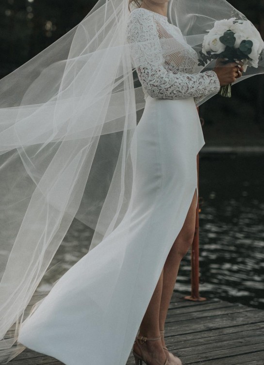 Polecam wyjątkową suknię ślubną o kroju rybki. Góra sukni zabudowana, z długim rękawem, uszyta z dwóch rodzajów gipiury, dół w kształcie rybki z rozcięciem po lewej stronie. Suknia posiada dopinany tren. Wygląda zjawiskowo i bardzo elegancko, moim zdaniem uszyta i wykończona jest idealnie. Istnieje możliwość obejrzenia i przymiarki w Krakowie lub w Janowie Lubelskim. Serdecznie polecam :)