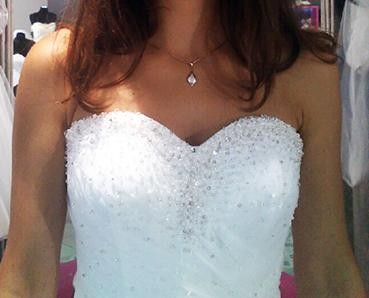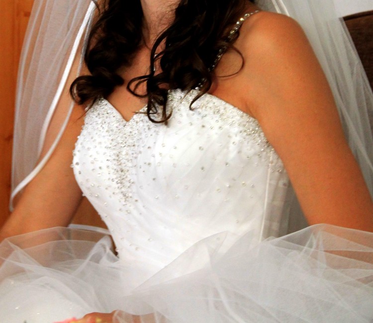 Gorset regulowany cienkimi sznurkami, dzięki czemu sukienka idealnie dostosowuje się do talii przyszłej panny młodej. Gorset ma kształt serca, jest bardzo wygodny i bardzo dobrze trzyma się ciała, nie ma problemów z opadaniem sukni. W sukni wszyte są uchwyty na doczepiane ramiączka. Suknia jest zdobiona cyrkoniami, koralikami i kryształkami (gorset), dolna część sukni podszyta jest dodatkową warstwą tiulu z elegancką, błyszczącą nicią, co sprawia że suknia subtelnie mieni się w blasku słońca/reflektorów, wszystkie dodatki zachowują gustowny ton, co dodaje elegancji.