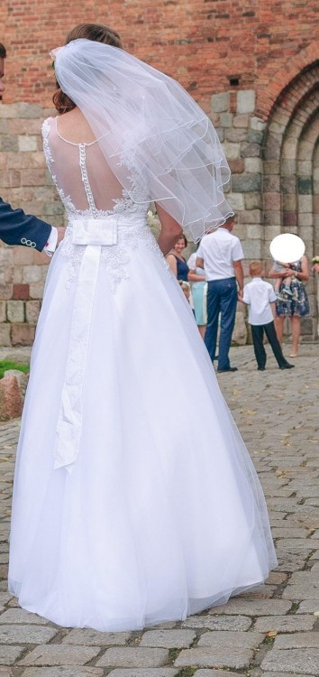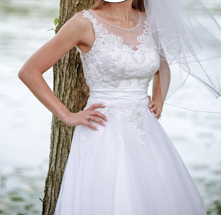 Mam do sprzedania przepiękną i bardzo wygodną suknię ślubną w kształcie litery A kupioną w salonie Visual Chris w Poznaniu w rozmiarze 36 na wzrost 172cm oraz obcas 2cm. Sukienka biała zdobiona perełkami i białym pasem. Oryginalny model delikatnie zmieniony: bardziej wykrojona koronka na plecach w kształt litery V oraz biały kolor pasa.