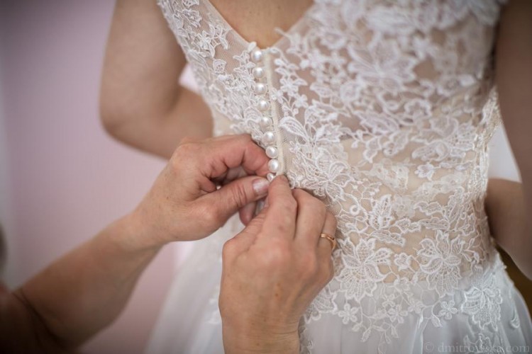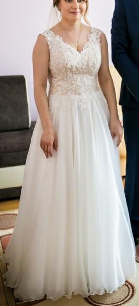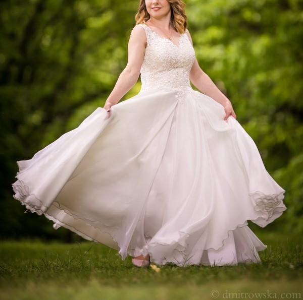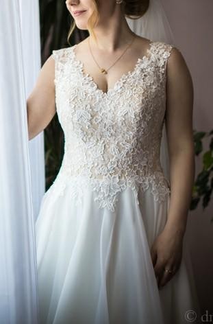 Suknia ślubna zakupiona w salonie Afrodyta. Wyjątkowa, własny projekt. Góra sukni (FLIRT) uszyta z gipiura, dekolt V, z tyłu zapinana na perełki. Pod spodem beżowy gorset. Dół sukni ( NEKTAR) uszyty z muślinu i składa się z kilku warstw materiału. Każda warstwa złożona jest z pasków materiału dzięki czemu suknia ślicznie układa się w tańcu. Suknia szyta na wysokość 160 cm + 8 cm obcas