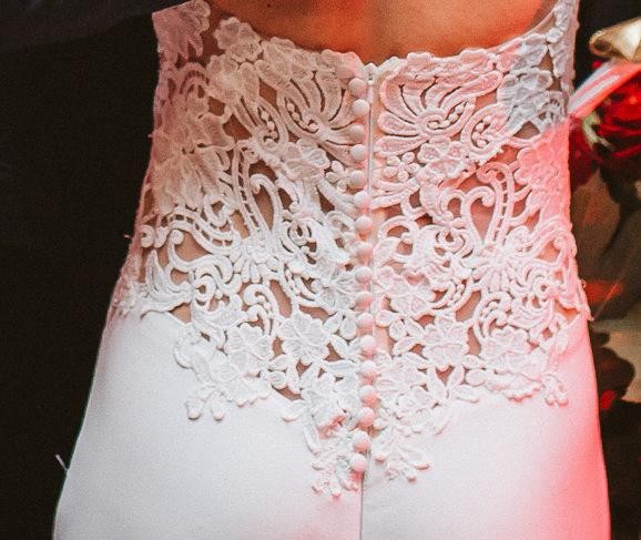 zjawiskowa śmietankowa suknia ślubna z delikatnym podpinanym do środka sukni trenem, odkrytymi plecami i ozdobiona grubą koronką