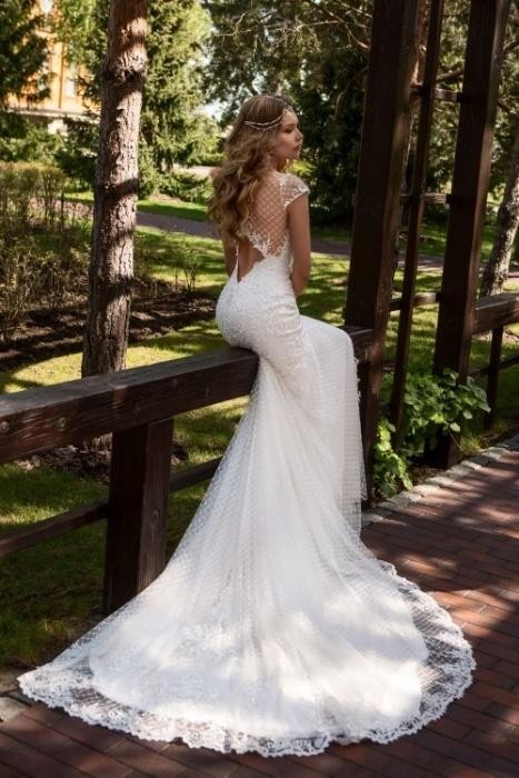 Suknia ślubna rybka z pięknym trenem i podkreślającym figurę wycięciem na plecach