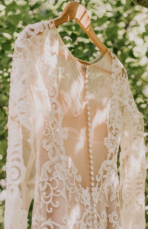 Suknia wykonana jest z oryginalnej połyskującej koronki w kolorze ecru na beżowej podszewce.