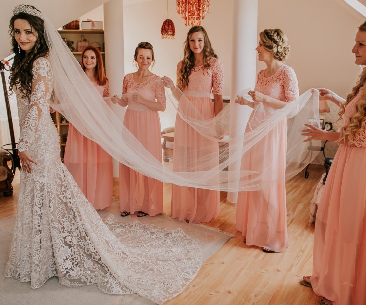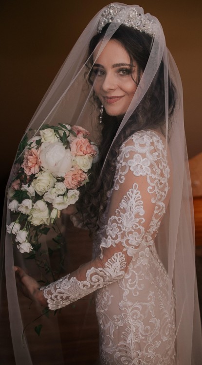 Suknia posiada wszyte miseczki oraz długi, efektowny tren zapinany na trzy guziczki. Przepięknie prezentuje się na żywo.