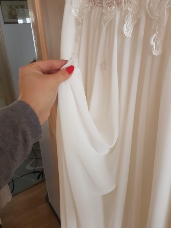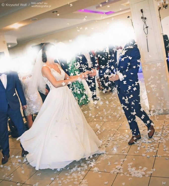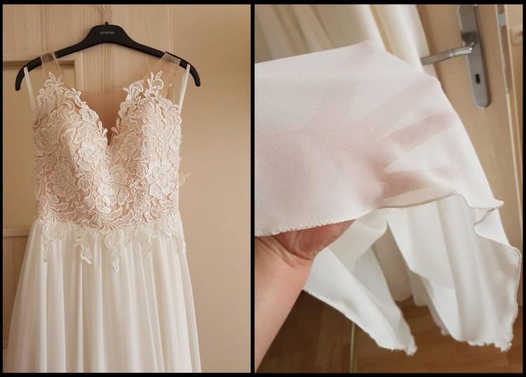 Suknia została uszyta dla mnie i założyłam ja dwa razy (ślub i sesja). Suknia została wyczyszczona w pralni chemicznej, jest w stanie idealnym. Suknia ta ładnie układa się w tańcu, jest zwiewna i była dla mnie bardzo wygodna.