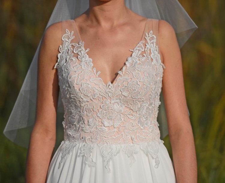 Sukienka posiada krótki tren z możliwością podpięcia.