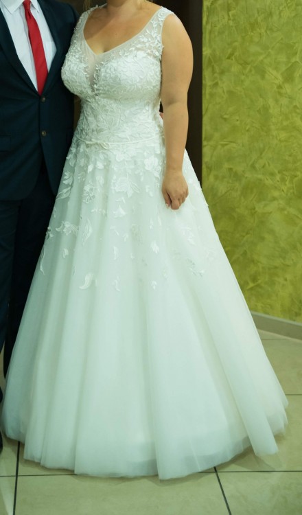 Sprzedam wyjątkową suknie ślubną w rozmiarze 42 o kolorze kremowej śmietany. Suknia była szyta w jednym z salonów na ul. Długiej w Krakowie a jej koszt wynosił 4000 zł. Była ona wykonana na mój indywidualny rozmiar w okolicy 42, polecam szczególnie kobietą z większym biustem gdyż posiada ona gorset, który ładnie podtrzymuje biust (rozmiar miseczki D) i z krągłościami gdyż sukienka pięknie uwydatnia talię zakrywając krąglejszą pupę i brzuch. Długość sukienki była szyta na wzrost 160 + 7 cm obcas. Sukienka w pełnym słońcu wygląda jak biała a ręcznie wyklejane na niej listki i kwiaty obszyte błyszczącą nitką i cekinami dodają jej uroku i blasku. W jedną z warstw sukni włożone jest koło, które w razie takie potrzeby bez problemu można wyciągnąć. Był to pierwszy model sukienki, który przymierzałam podczas poszukiwań sukni ślubnej, od razu się w niej zakochałam i już nigdzie nie znalazłam lepszej. Suknia była prana. Serdecznie polecam i zapraszam do przymierzenia!